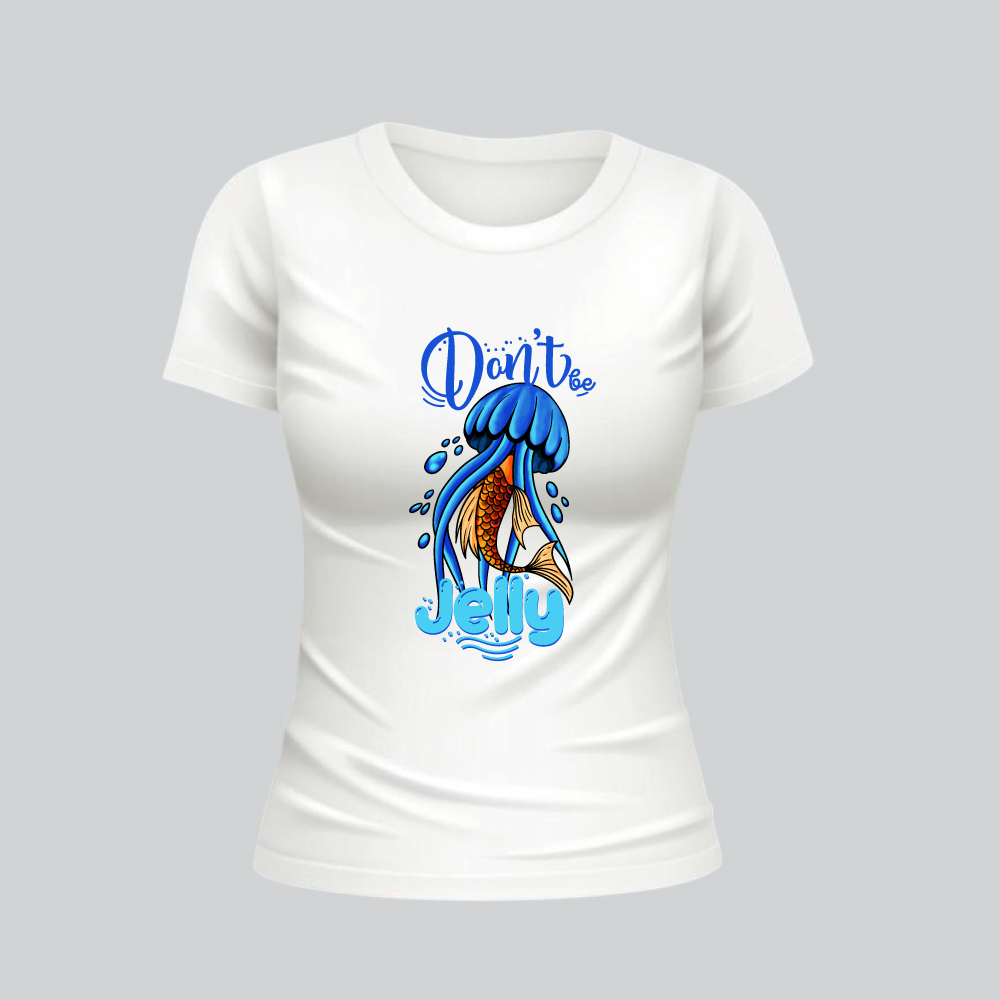 Bring a splash of humour to your style with this pun-filled “Don’t Be Jelly” T-shirt design from S3T Fashion! Featuring a vibrant blue jellyfish wrapped around a colorful goldfish, this playful ocean-themed graphic is perfect for those who love witty puns and aquatic art. The bold, fun typography and lively illustration make it a standout piece for beach lovers, marine biologists, or anyone who appreciates clever designs with a tropical twist.